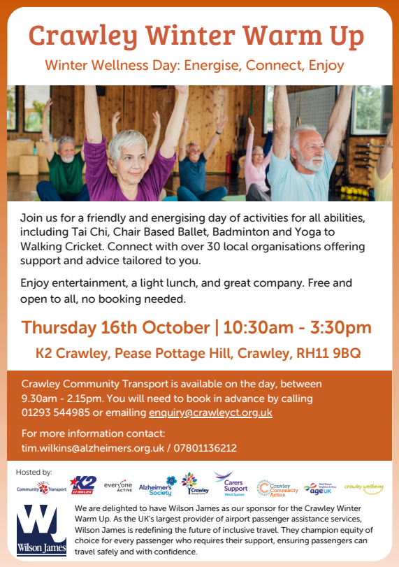 Crawley Winter Warm Up Posted on: 14th October 202514th October 2025 When: Thursday 16th October 10:30am to 3:30pmWhere: K2 Crawley, Pease Pottage Hill, Crawley, RH11 9BQ